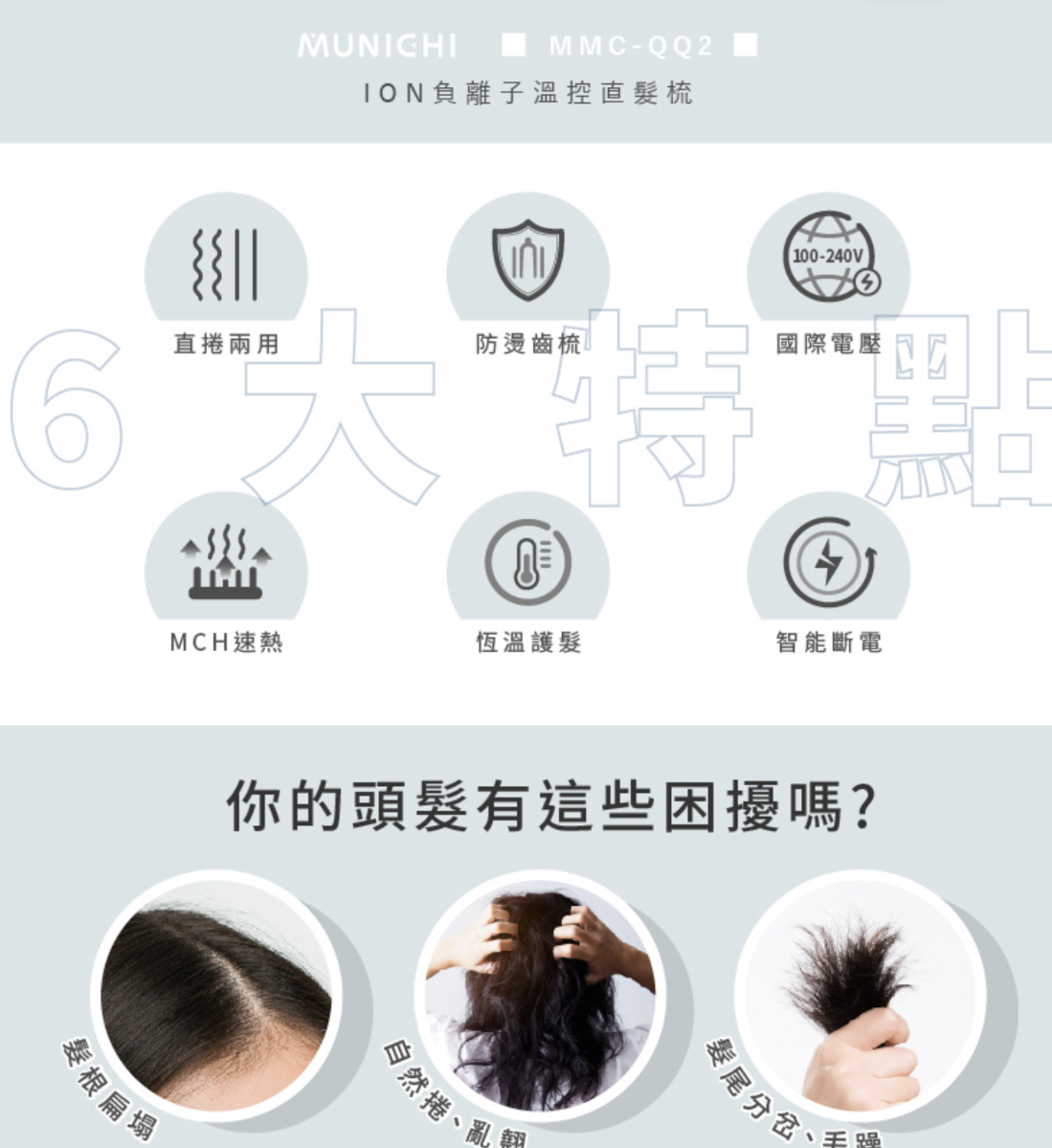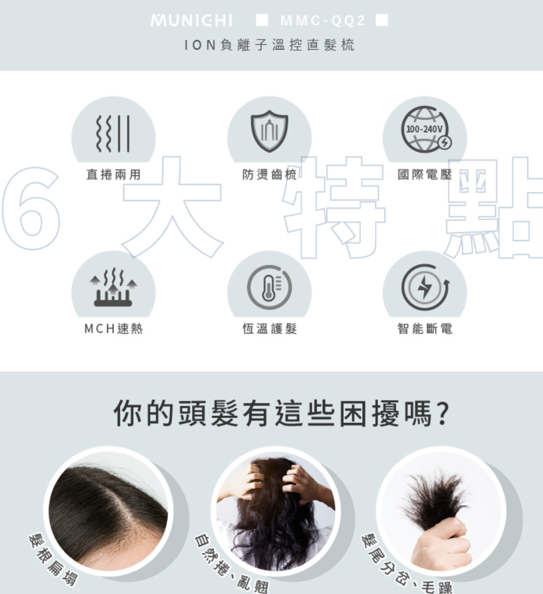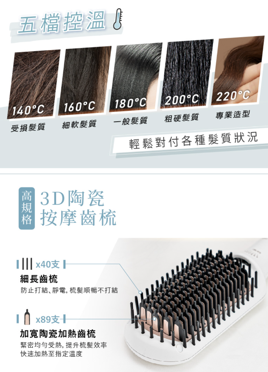 型號:MMC-QQ2 產品尺寸:6.3X2X28CM 面板尺寸:10.5X5.5CM 產品淨重:400g(含電源線) 額定電壓及頻率:100V~240V/60Hz 額定功率:60W 調控溫度:5段溫控(140°C~220°C) 配件:主機、收納袋、說明書 商檢字號:T51434 產地:中國 保固:一年